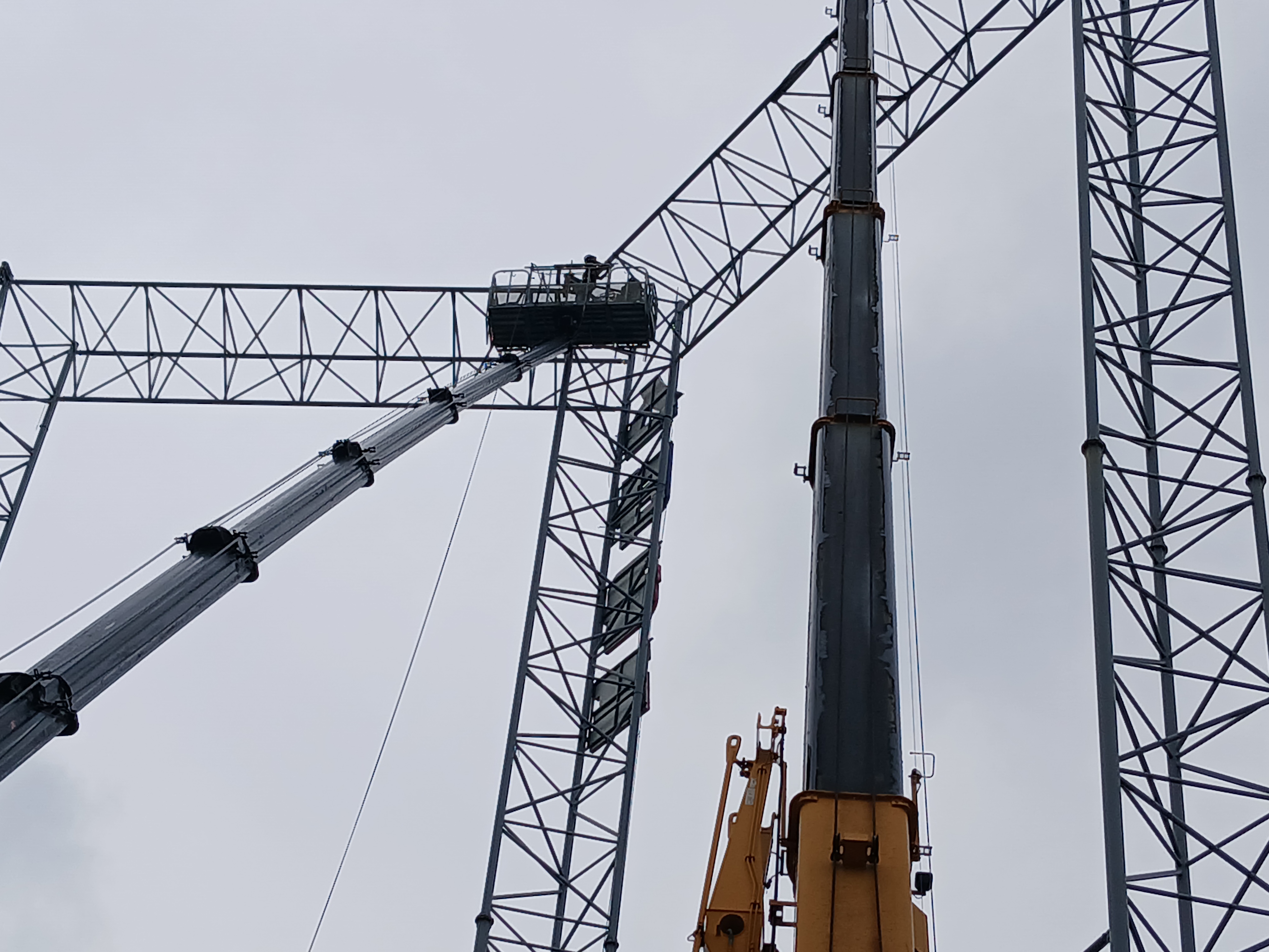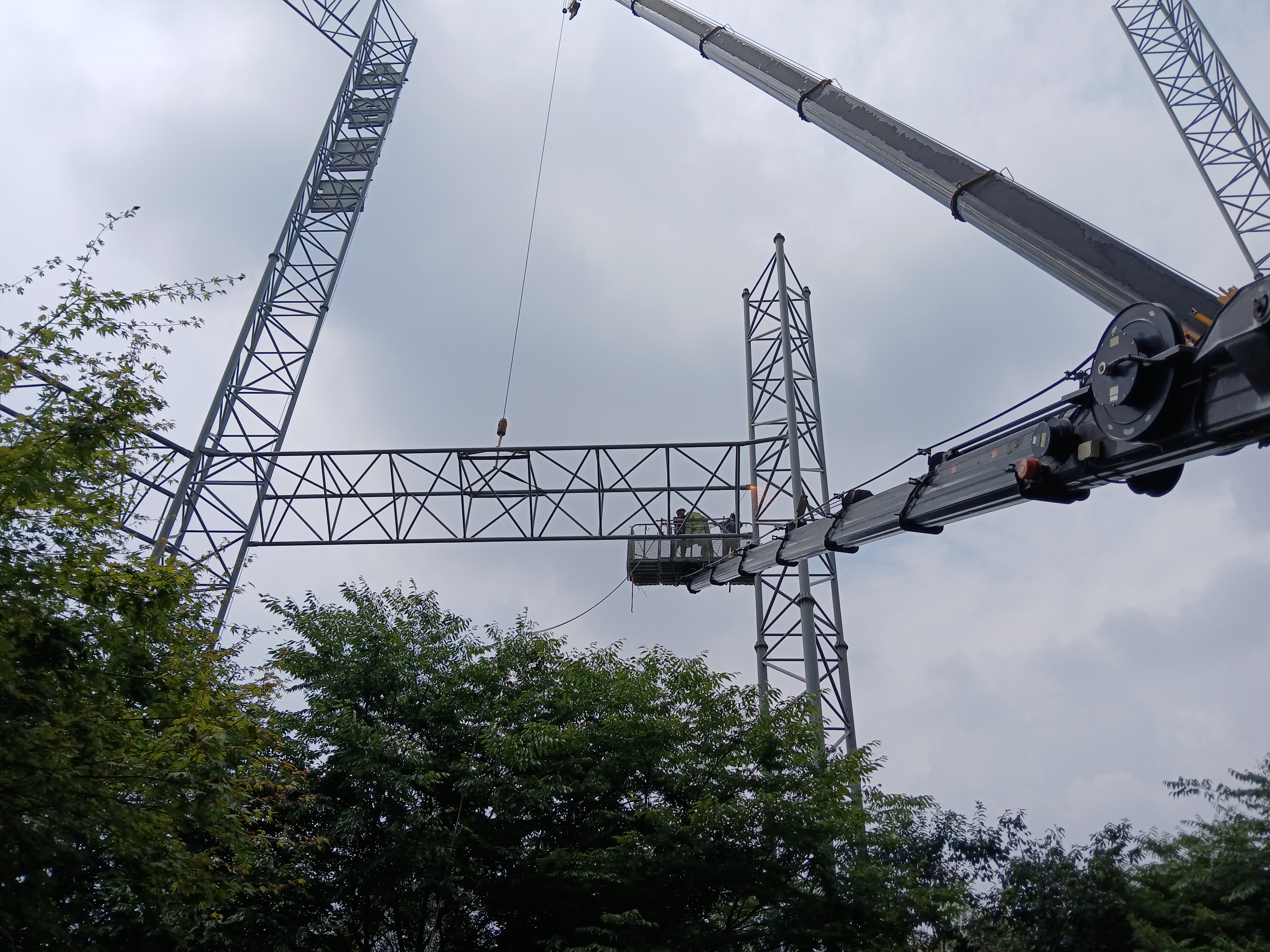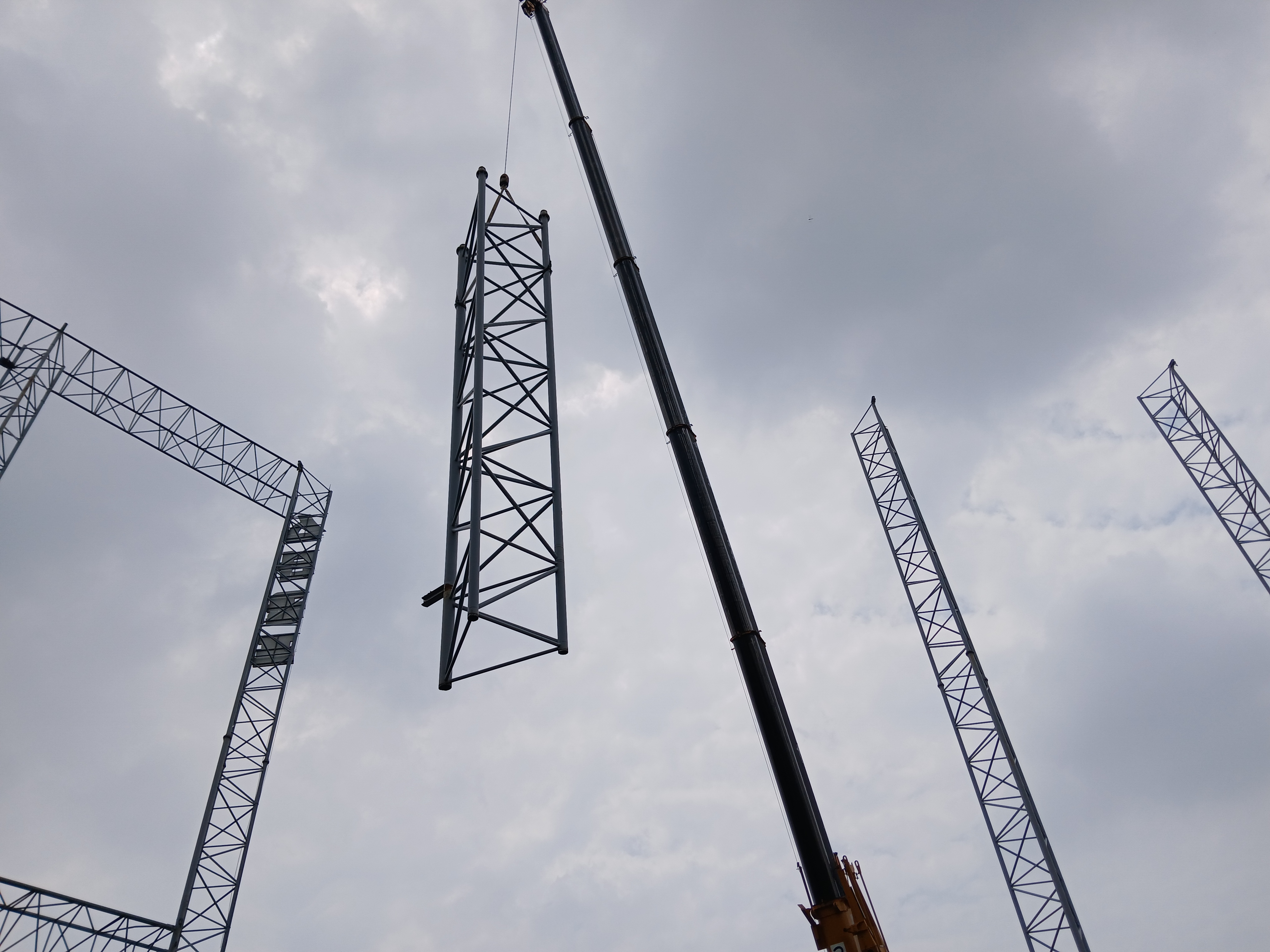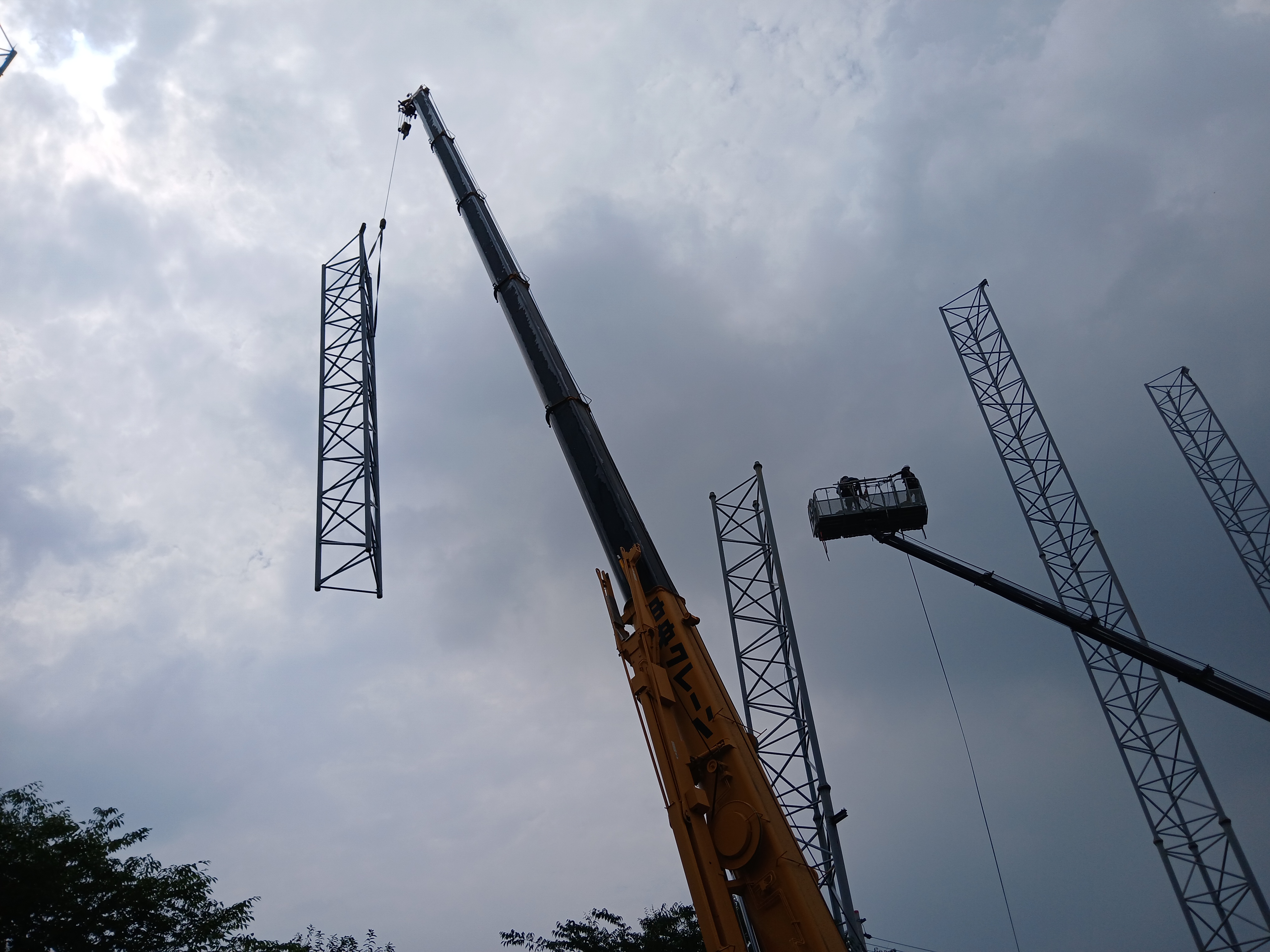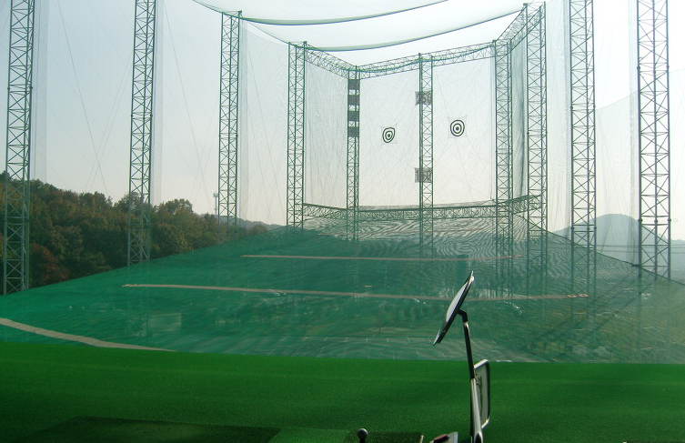 골프연습장의 상층부 그물망을 지탱하는 높은 철골 빔은 해체 시 고도의 기술과 안전 관리가 필수입니다.