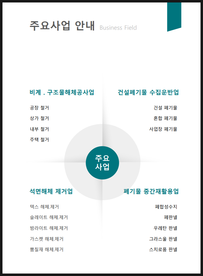 비계구조물 해체공사업은 물론이고, 건설폐기물 수집운반업과 폐기물 중간 재활용업을 함께 운영하고 있는