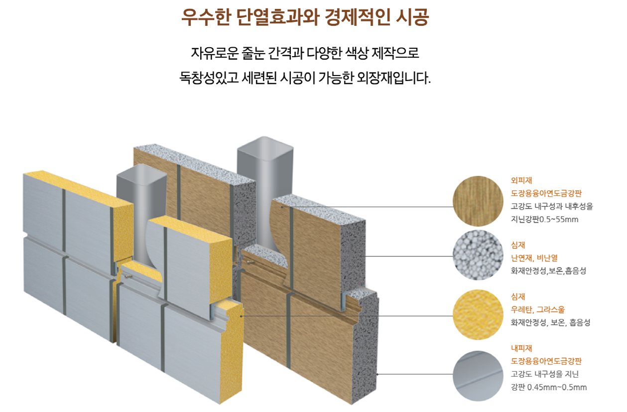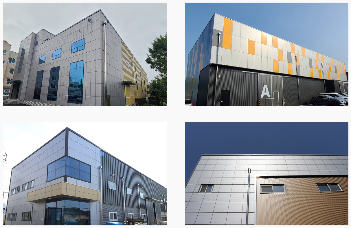 공장의 사무동 또는 상업용 빌딩, 연구소나 체육시설 등에 많이사용되며,노후화된 건물 리모델링용 자재로도 많이 사용되는 자재입니다.