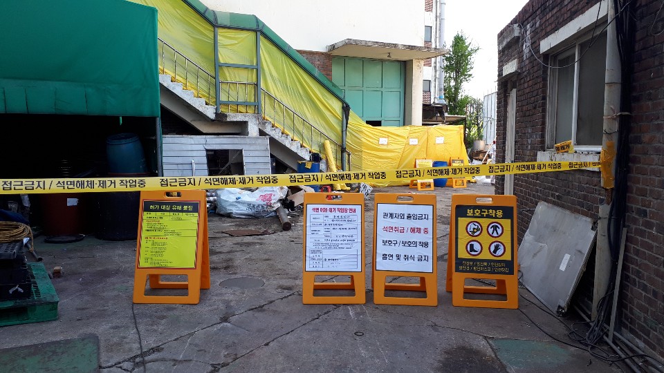 이러한 표지판과 노란 띠를 보신다면, 절대 들어가시면 안 됩니다. 위에도 말씀드린 것처럼 석면 분진은 인체에 정말 유해한 물질입니다.