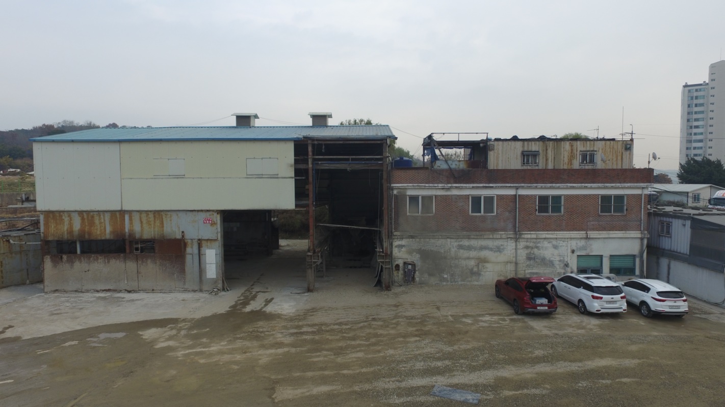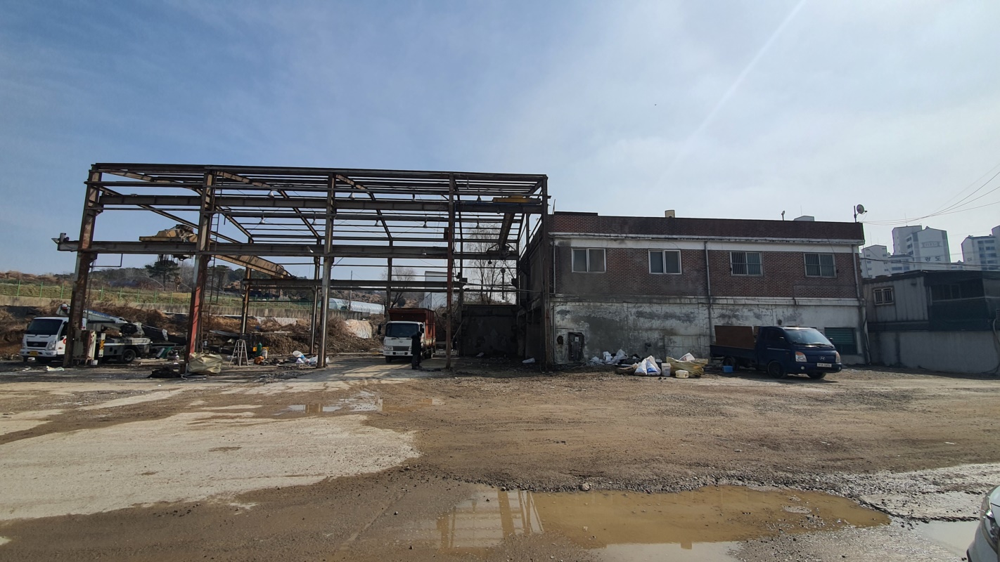 좌측에 보이는 판넬건물은 외벽과 지붕판넬을 모두 철거한 후 빔 도색작업을 진행하고